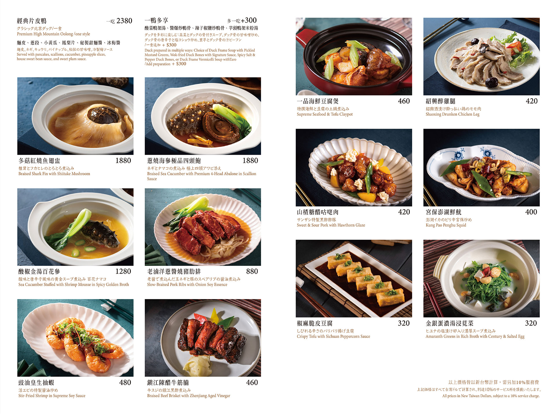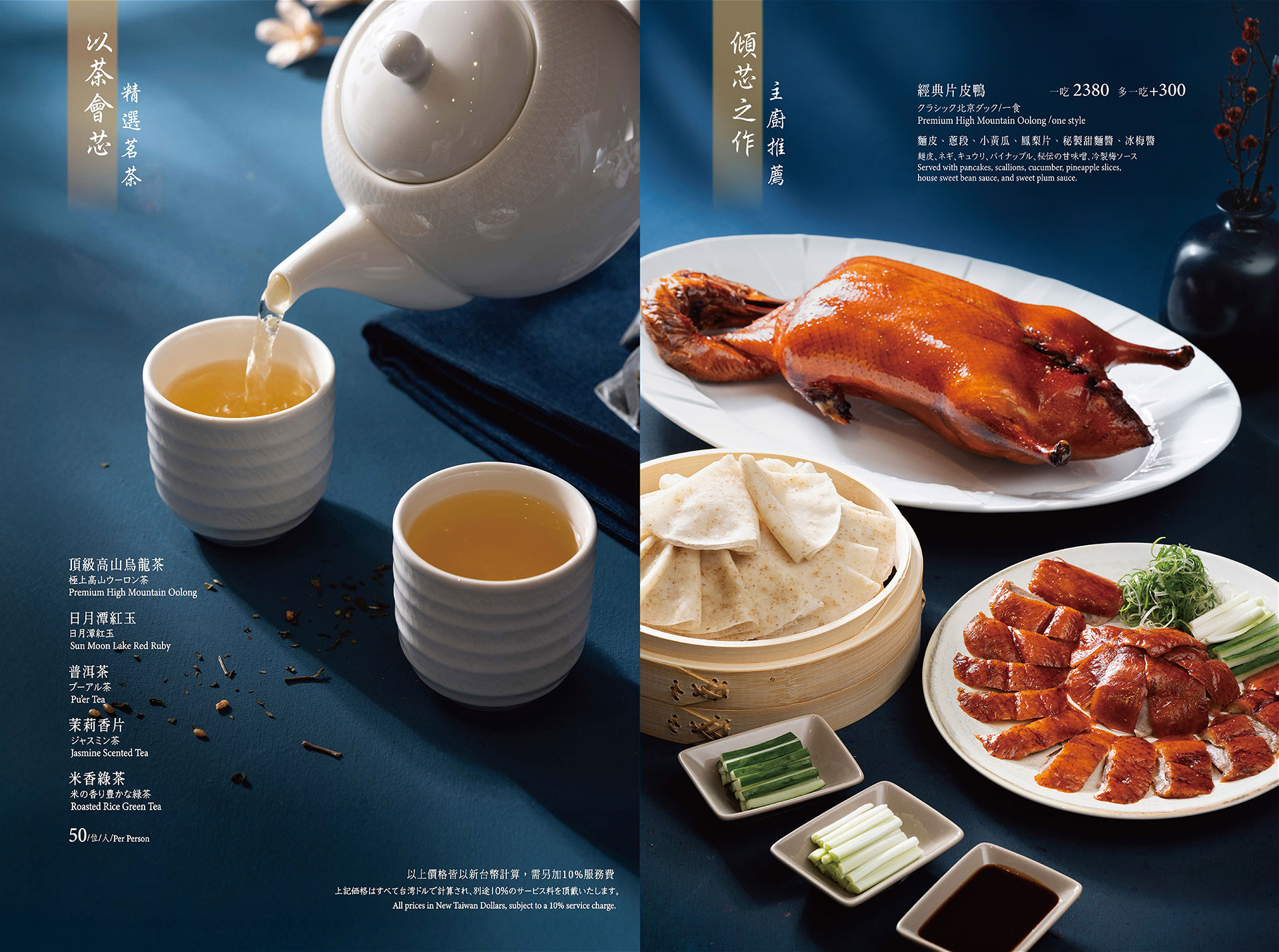 - 經典片皮鴨: 慢火烤製出皮脆肉嫩的極致平衡,鎖住油脂與香氣的交織。